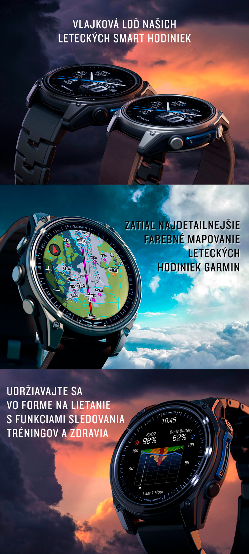 Pokročilé farebné pohyblivé mapy obsahujú vzdušné priestory, dráhy, letiská, prekrytie letových plánov a ďalšie informácie – ponúkajú vám najlepšie a najpodrobnejšie mapy zo všetkých doterajších pilotných hodiniek Garmin.