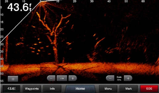 V režime LIVEVÜ DOWN získate priamy náhľad pod vodnú hladinou pod plavidlom až do hĺbky 61m pod uhlom 20° x 135°, so živým náhľadom v reálnom čase. V režime LIVEVÜ DOWN zobrazuje sonar v reálnom čase objekty a štruktúru dna pod plavidlom. Môžete dokonca sledovať, ako ryby reagujú na pohybujúcu sa návnadu.