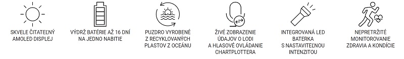 Okrem funkcií pre navigáciu a pobyt na vode sú hodinky vhodné aj pre potápanie (do 40m), majú vodotesné tlačítka, kovový kryt snímačov a jasný 1,4” AMOLED displej so zafírovým sklíčkom, ktoré je mimoriadne odolné voči poškriabaniu. Aplikácie na plachtenie a jachting poskytujú údaje na sledovanie času stráveného na vode. Navyše vďaka upozorneniam na blížiaci sa príliv a odliv a ťahanie kotvy budete na vode vždy v strehu. K dispozícii sú aj funkcie plachtenia, ako napríklad pomoc pri plavbe, navigácia na štarte pretekov a časovač regaty.