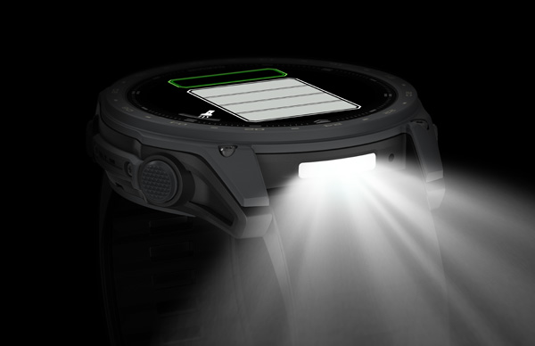 V púzdre hodiniek je integrovaná výkonná LED baterka s nastaviteľným jasom v niekoľkých úrovniach a bielym alebo zeleným svetlom. LED baterka je praktickým pomocníkom nielen pri orientácií pri zníženej viditeľnosti ale aj v pripáde potreby bezpečnostného osvetlenia.