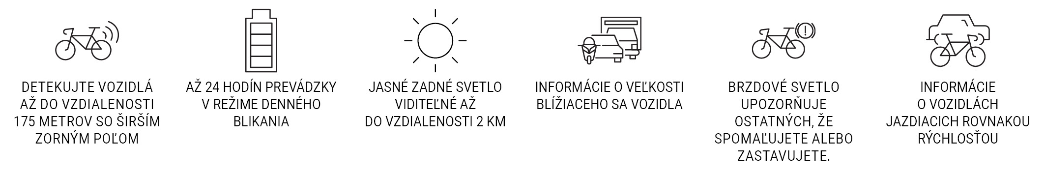 Vďaka našej najvýkonnejšej a najpresnejšej technológii radarového sledovania detekuje veľkosť vozidla a úroveň ohrozenia so širším zorným poľom. Technológia radarového sledovania identifikuje vozidlá, ktoré sa blížia zozadu rovnakou rýchlosťou alebo sa ich pokúšajú predbehnúť. Zadné (červené) svetlo je viditeľné až do vzdialenosti 2 km a má jedinečný vzor blikania brzdového svetla, ktorý upozorní ostatných účastníkov cestnej premávky, keď spomaľujete alebo zastavujete. Pre pokoj v duši a zachovanie sústredenosti aj na tých najdlhších jazdách získate až 24 hodín výdrže batérie v dennom režime blikania a až 30 hodín výdrže batérie v režime iba s radarovým signálom.