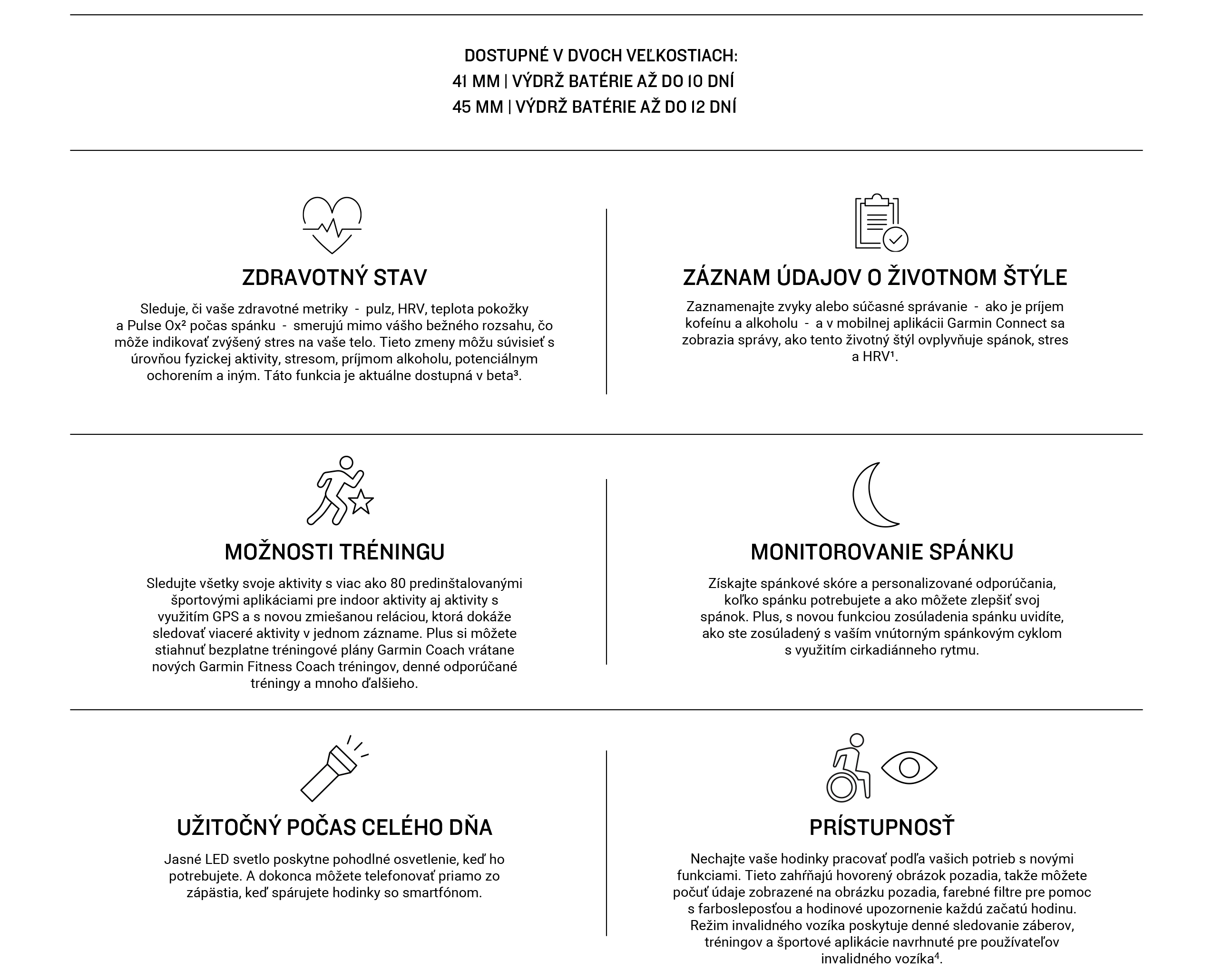Zariadenia na sledovanie aktivity od spoločnosti Garmin sú nástroje určené na poskytovanie informácií na zachovanie aktívneho a zdravého životného štýlu. Zariadenia na sledovanie aktivity od spoločnosti Garmin fungujú pomocou snímačov, ktoré sledujú váš pohyb. Údaje a informácie poskytované týmito zariadeniami sú určené na presné sledovanie vašej aktivity, nemusia však byť presné na 100% vrátane údajov o krokoch, spánku, vzdialenosti a kalóriách. Zariadenia na sledovanie aktivity od spoločnosti Garmin nie sú medicínske prístroje a údaje nimi poskytované nie sú určené na medicínske účely ani diagnostiku, ošetrenie, liečbu alebo prevenciu akýchkoľvek zdravotných problémov. Spoločnosť Garmin odporúča poradiť sa so svojím lekárom pred tým, ako sa začnete venovať nejakej športovej činnosti.