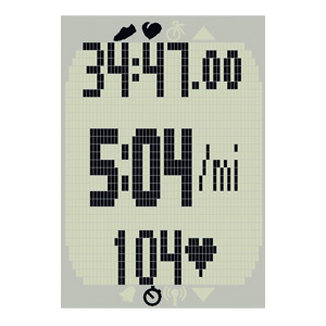 Základné zobrazované dáta v tréningovom režime: srdcový pulz HRM, čas (stopky) + priemerné hodnoty, automatické okruhy. V režime hodiniek: štandardné hodinkové funkcie (čas, dátum, alarm).