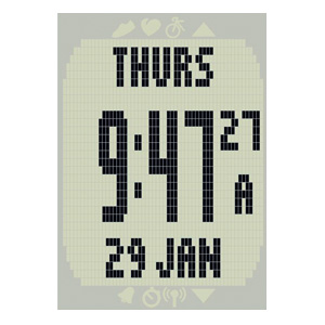 Základné zobrazované dáta v tréningovom režime: srdcový pulz HRM, čas (stopky) + priemerné hodnoty, automatické okruhy. V režime hodiniek: štandardné hodinkové funkcie (čas, dátum, alarm).