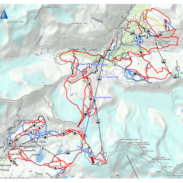 POKRYTIE MAPY: pokryté územie obsahuje zmapované územia zimných rezortov v strednej Európe - Alpy, Bavorský les, Čierny Les, Pyreneje. V rámci mapy sú aj farebné značené zjazdovky na bielom podklade.