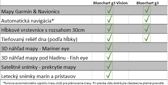 Nová edícia námorných máp od spoločnosti Garmin prínáša o.i. spojenie najlepších námorných máp na trhu. Bluechart G3 Vision je výsledkom spojenia mapových dát a iného obsahu spoločností Garmin & Navionics®. Bluechart G3 Vision edícia námorných/riečnych máp na prednahratých kartách štandardizovaného formátu (micro) SD, ktoré sú optimalizované pre modelové rady nových námorných zariadení zo série GPSmap a echoMAP. Edícia Bluechart G3 Vision ponúka oproti ediícií >Bluechart G3 predovšetkým rozšírený obsah (satelitné a letecké snímky), pokročilé zobrazovanie mapy (Mariners & Fish Eye) a ďalšie podrobnosti. Nová edícia vnútozemských riečnych máp a vodných tokov pochádza z originálnych (oficiálnych) a súkromných (overených) zdrojov. Detailné námorné (riečne) mapy z edície Bluechart G3 Vision kombinujú používanie originálnych máp vo vektorovom (digitálnom) formáte, ktorý je optimalizovaný pre Garmin GPS zariadenia.