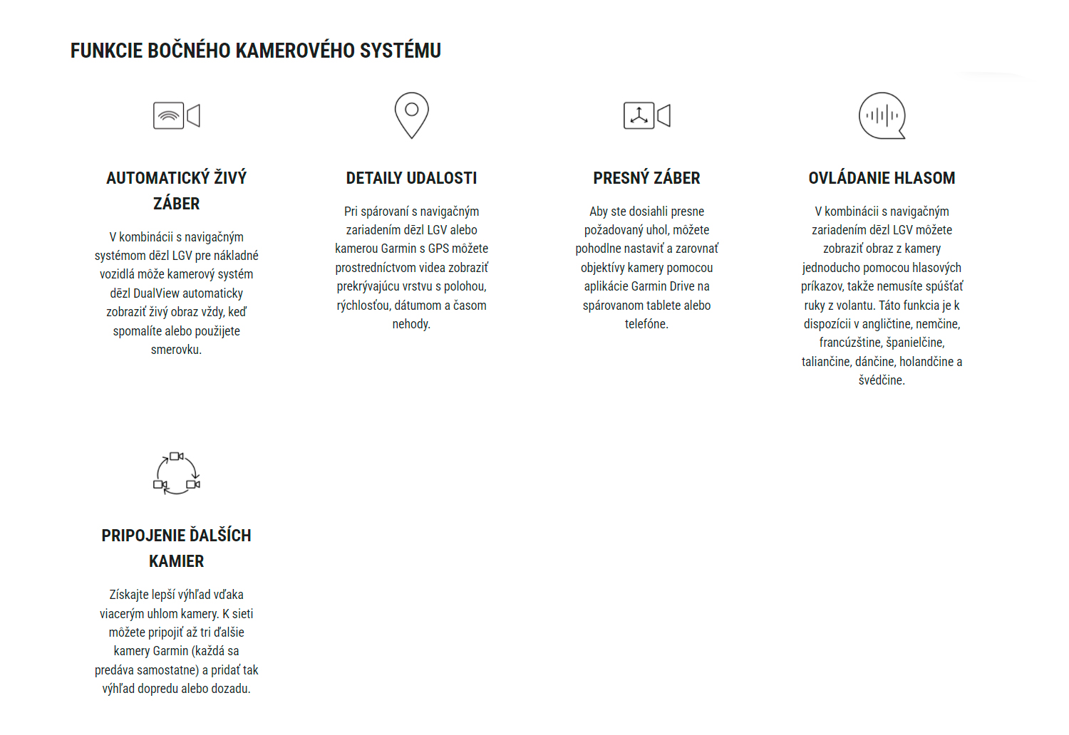Tento odolný systém s dvoma kamerami poskytuje živý obraz situácie po oboch stranách nákladného vozidla, čím profesionálnym vodičom poskytuje lepší prehľad o situácii v okolí. Pri zobrazení na spárovanom tablete alebo navigačnom zariadení dezl™ LGV pre nákladné vozidlá systém dezl DualView ponúka aj monitorovanie mŕtvych uhlov a upozornenia na predbiehanie, ako aj automatické nahrávanie HD videa v prípade detekcie nehody.