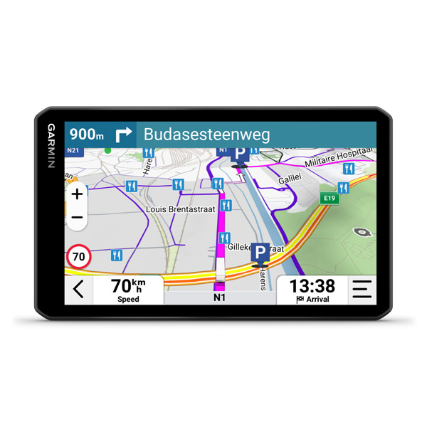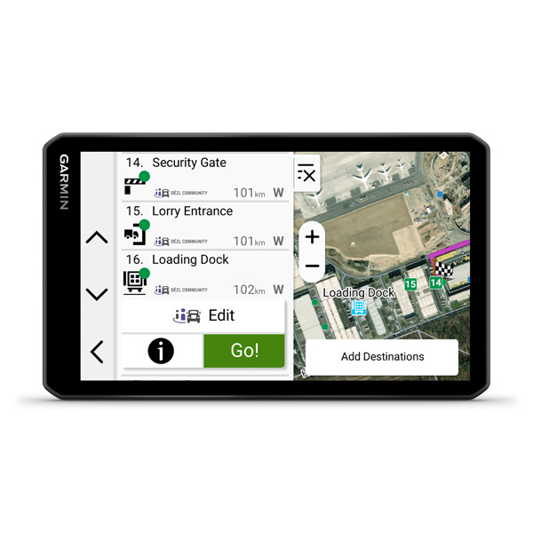 Satelitný navigačný systém s 7" displejom dezl™ LGV720 ponúka dôležité komunitné funkcie dezl, ktoré uľahčujú život na cestách profesionálnym vodičom nákladných vozidiel. Získajte prehľad o parkoviskách, nakladacích dokoch a preferovaných miestach pre nákladné vozidlá na základe hodnotení od ostatných vodičov.