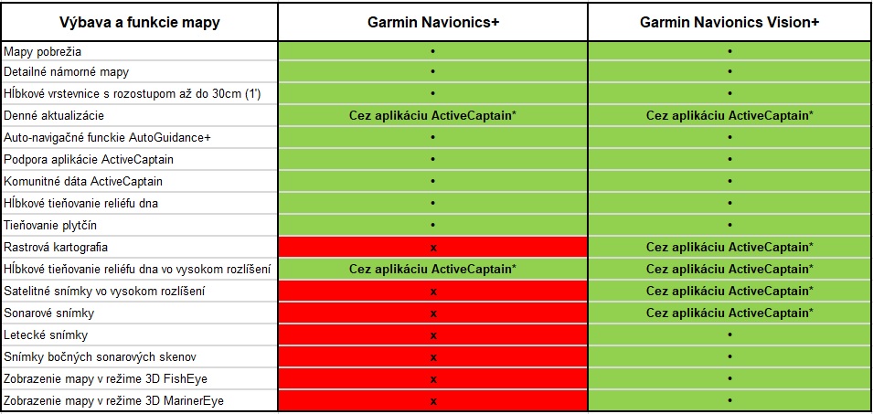 Základná edicia novej generácie námorných máp Garmin Navionics+ ponúka pre porovnanie nasledovné funkcie a výbavu: