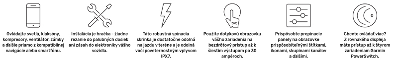 Garmin PowerSwitch™ je kompaktný digitálny spínací box, ktorý ponúka pohodlné centralizované ovládanie 12-voltového príslušenstva vášho vozidla z kompatibilného navigačného zariadenia Garmin alebo smartfónu.