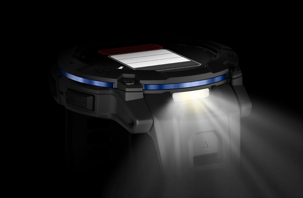 V puzdre hodiniek sa nachádza výkonná LED baterka s nastaviteľným jasom v niekoľkých úrovniach a bielym alebo červeným svetlom.