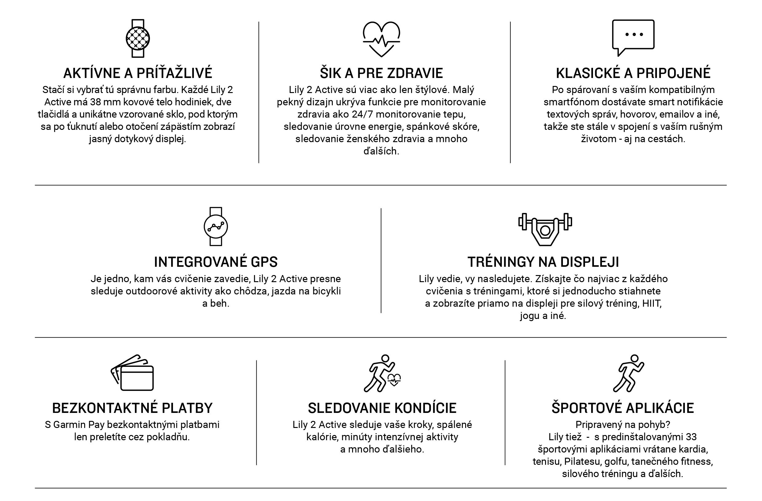 Zariadenia na sledovanie aktivity od spoločnosti Garmin sú nástroje určené na poskytovanie informácií na zachovanie aktívneho a zdravého životného štýlu. Zariadenia na sledovanie aktivity od spoločnosti Garmin fungujú pomocou snímačov, ktoré sledujú váš pohyb. Údaje a informácie poskytované týmito zariadeniami sú určené na presné sledovanie vašej aktivity, nemusia však byť presné na 100% vrátane údajov o krokoch, spánku, vzdialenosti a kalóriách. Zariadenia na sledovanie aktivity od spoločnosti Garmin nie sú medicínske prístroje a údaje nimi poskytované nie sú určené na medicínske účely ani diagnostiku, ošetrenie, liečbu alebo prevenciu akýchkoľvek zdravotných problémov. Spoločnosť Garmin odporúča poradiť sa so svojím lekárom pred tým, ako sa začnete venovať nejakej športovej činnosti.