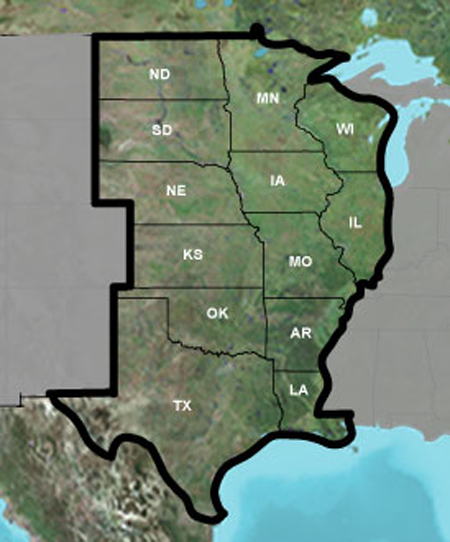 Región CENTRAL obsahuje tieto štáty: AR, IL, MN, MO, ND, NM, OK, SD, TX, WI, WY • Arkansas • Buffalo National River • Hot Springs National Park • Ouachita National Forest • Illinois • Shawnee National Forest • Minnesota • Chippewa National Forest • Voyageurs National Park • Superior National Forest / Boundary Waters Canoe Area Wilderness • Missouri • Mark Twain National Forest • Ozark National Scenic Riverway • North Dakota • Theodore Roosevelt National Park • Oklahoma • Ouachita National Forest • South Dakota • Badlands National Park • Black Hills National Forest, SD/WY • Custer State Park • Wind Cave National Park • Texas • Angelina National Forest • Big Bend National Park • Davy Crockett National Forest • Guadalupe Mountains National Park, TX/NM • Padre Island National Seashore • Sabine National Forest • Sam Houston National Forest • Wisconsin • Apostle Islands National Lakeshore