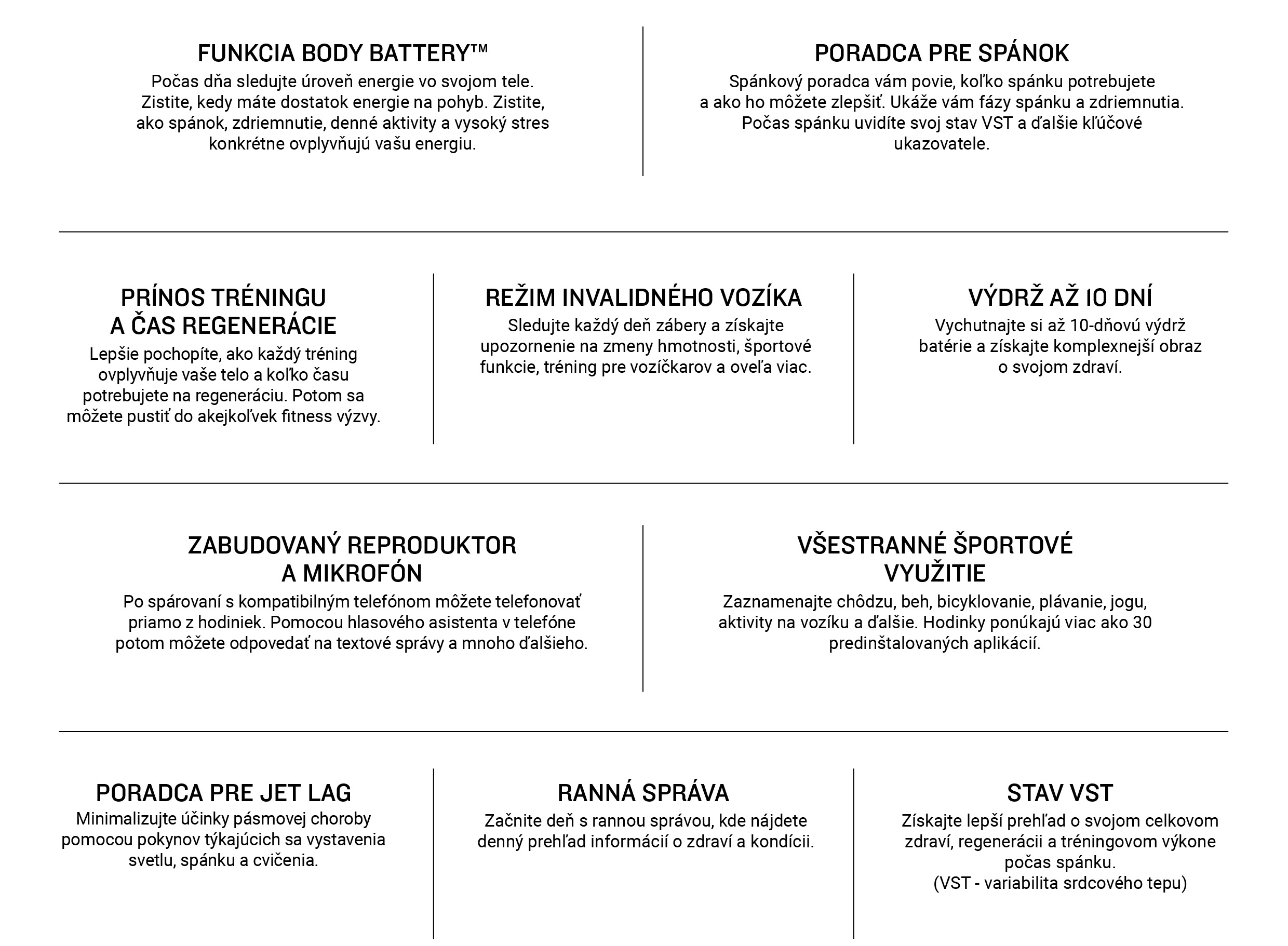 | Akumulátor - výdrž (pohotovostný režim): | až do 10 dní v režime smart hodiniek (24/7 monitorovanie pulzu, bez GPS), až do 21 hodín so zapnutým GPS |