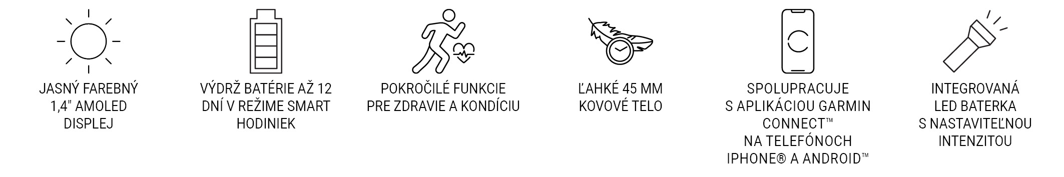 Zariadenia na sledovanie aktivity od spoločnosti Garmin sú nástroje určené na poskytovanie informácií na zachovanie aktívneho a zdravého životného štýlu. Zariadenia na sledovanie aktivity od spoločnosti Garmin fungujú pomocou snímačov, ktoré sledujú váš pohyb. Údaje a informácie poskytované týmito zariadeniami sú určené na presné sledovanie vašej aktivity, nemusia však byť presné na 100% vrátane údajov o krokoch, spánku, vzdialenosti a kalóriách. Zariadenia na sledovanie aktivity od spoločnosti Garmin nie sú medicínske prístroje a údaje nimi poskytované nie sú určené na medicínske účely ani diagnostiku, ošetrenie, liečbu alebo prevenciu akýchkoľvek zdravotných problémov. Spoločnosť Garmin odporúča poradiť sa so svojím lekárom pred tým, ako sa začnete venovať nejakej športovej činnosti.