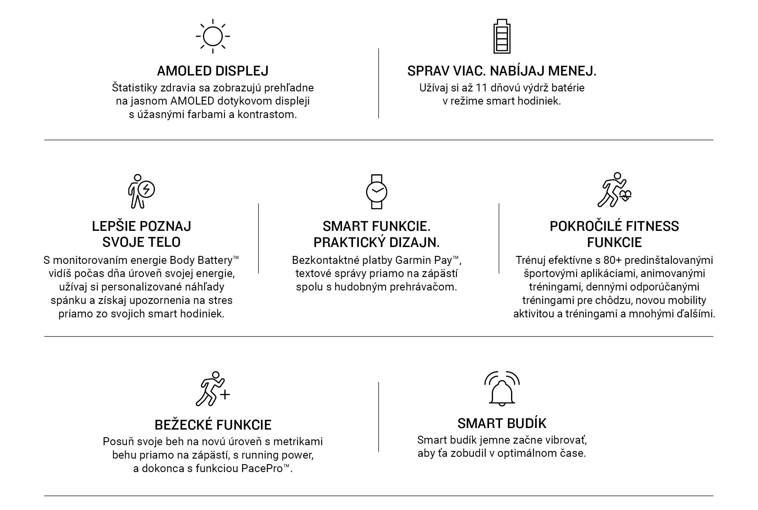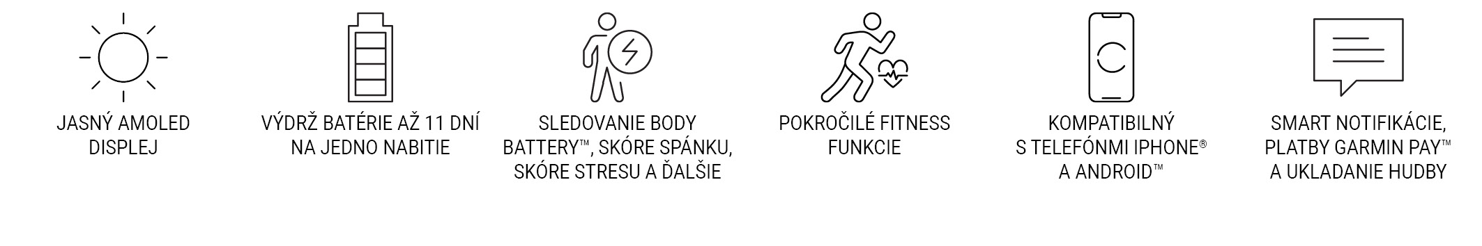 Zariadenia na sledovanie aktivity od spoločnosti Garmin sú nástroje určené na poskytovanie informácií na zachovanie aktívneho a zdravého životného štýlu. Zariadenia na sledovanie aktivity od spoločnosti Garmin fungujú pomocou snímačov, ktoré sledujú váš pohyb. Údaje a informácie poskytované týmito zariadeniami sú určené na presné sledovanie vašej aktivity, nemusia však byť presné na 100% vrátane údajov o krokoch, spánku, vzdialenosti a kalóriách. Zariadenia na sledovanie aktivity od spoločnosti Garmin nie sú medicínske prístroje a údaje nimi poskytované nie sú určené na medicínske účely ani diagnostiku, ošetrenie, liečbu alebo prevenciu akýchkoľvek zdravotných problémov. Spoločnosť Garmin odporúča poradiť sa so svojím lekárom pred tým, ako sa začnete venovať nejakej športovej činnosti.