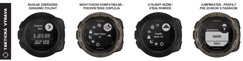 Nové modely Instinct Tactical rozširujú ponuku obľúbenej série > > >Instinct o pokročilejšie taktické modely so zodpovedajúcou výbavou. Instinct Tactical navyše ponúka možnosť duálneho zobrazovania súradníc polohy (2 formáty) s podporou optimalizovaného podsvietenia displeja v režime nightvision (nočného videnia). Taktickú výbavu ďalej dopĺňa tzv. utajený stealth režim hodiniek. Po jeho aktivovaní sa deaktivuje bezdrôtová komunikácia, optický pulzomer a tiež sa automaticky upraví úroveň podsvietenia displeja. Pre zoskok s padákom je dostupná funkcia Jumpmaster, ktorá umožňuje optimálne sledovať prebieh letu podľa typu zoskoku.