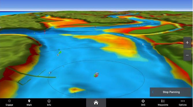 Zobrazenie farebného škálovania mapy v závislosti od nastavení podľa hĺbky vody. Máte k dispozícií až 10 rôznych hĺbkových rozsahov pre zobrazenie oblastí s minimálnou/maximálnou resp. požadovanou hĺbkou. Mapy tiež obsahujú hĺbkové vrtevnice s rozostupom od 30cm pre detailný náhľad štuktúry dna pod vodnou hladinou.