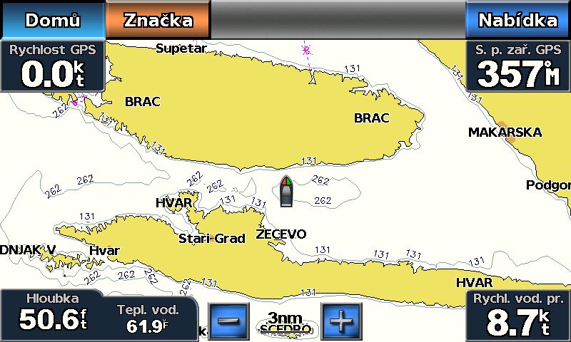 Novinkou je môžnosť farebného škálovania mapy v závislosti od nastavení podľa hĺbky vody. Máte k dispozícií až 10 rôznych hĺbkových rozsahov pre zobrazenie oblastí s minimálnou/maximálnou resp. požadovanou hĺbkou. Mapy tiež obsahujú hĺbkové vrtevnice s rozostupom od 30cm pre detailný náhľad štuktúry dna pod vodnou hladinou.