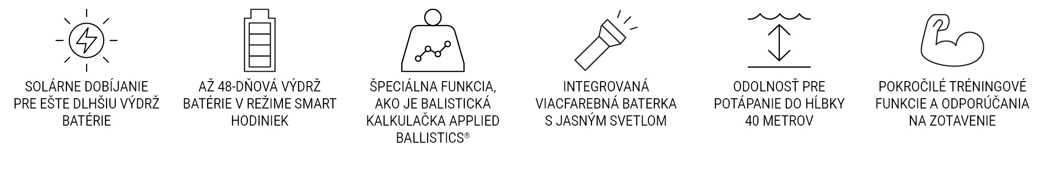| Akumulátor - výdrž: | Režim smart hodiniek: až do 30 dní / 48 dní so solárnym dobíjaním*, Režim GPS: až do 95 hodín / 149 hodín so solárnym dobíjaním** |