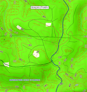 • vrstevnice s krokem 10 metrů, liniové tvary roklí, plochy skalních útvarů,