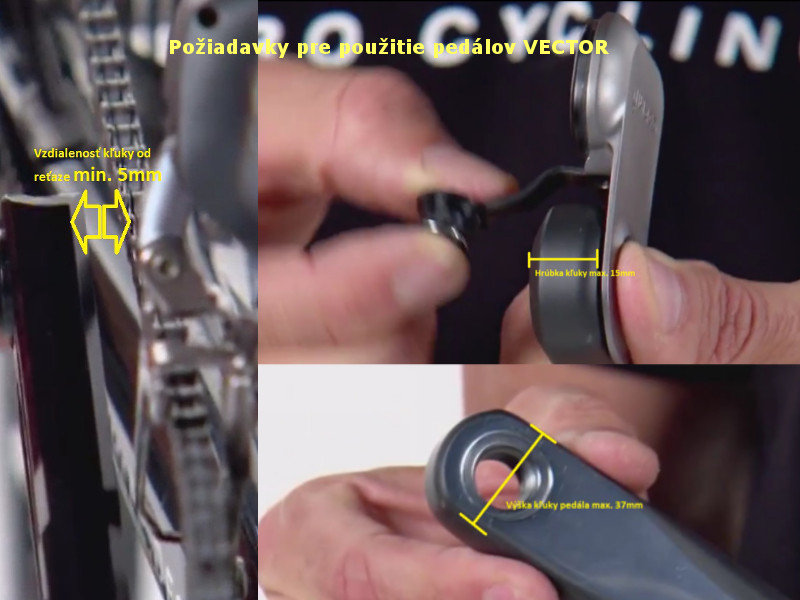 *podmienky použitia (kompatibilita) Vector: max. šírka kľuky v mieste závitu 44mm a max. hrúbka kľuky v mieste závitu je od 15mm-18mm. Minimálna vzdialenosť kľuky od reťaze je 5mm. Upozornenie: priložené pedal PODy sú kompatibilné iba ak kľuka dosahuje min. hrúbku 15mm.