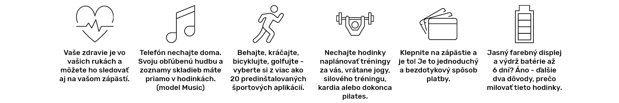| Akumulátor - výdrž (pohotovostný režim): | až do 6 dní v režime smart hodiniek (24/7 monitorovanie pulzu, bez GPS), až do 6 hodín so zapnutým GPS a s hudbou, až do 14 hodín (s GPS) |